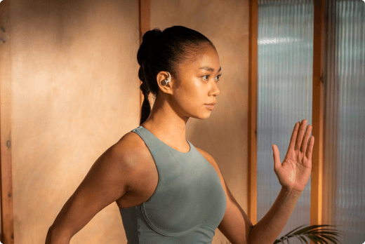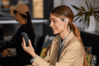 Optimizing the design and material of open-ear earbuds, OpenFit is compact and light, weighing just 8.3 grams.4 The earbuds and battery compartment provide a perfect balance that makes you forget you’re even wearing them.